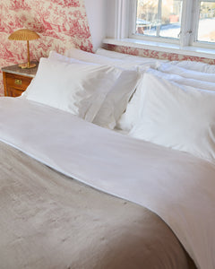 The feeling of satin but with a less shiny look, it's the absolute most beautiful and softest in a bedroom.