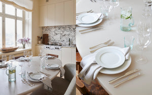 I like setting up a comfortable and inviting table for all kinds of meals, even casual ones. I prefer either a proper table setting with plate on plate, two wine glasses, linen napkins and so on, or a really simple familiar setting – like serving a super simple burger on a tray. I don't like the in-between setting with a knife and fork and a plate.