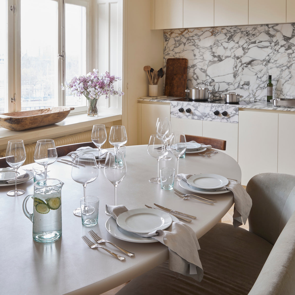 Elegance meets lightness. This Crystal White Wine glass combines functionality and aesthetics to perfection. Designed to carry most white wines and lighter reds, this glass is durable, dishwasher safe and shines like a gemstone. It’s as thin as a glass can be, and thanks to the laser-cut rim the aroma from the beverage is preserved to the max.
