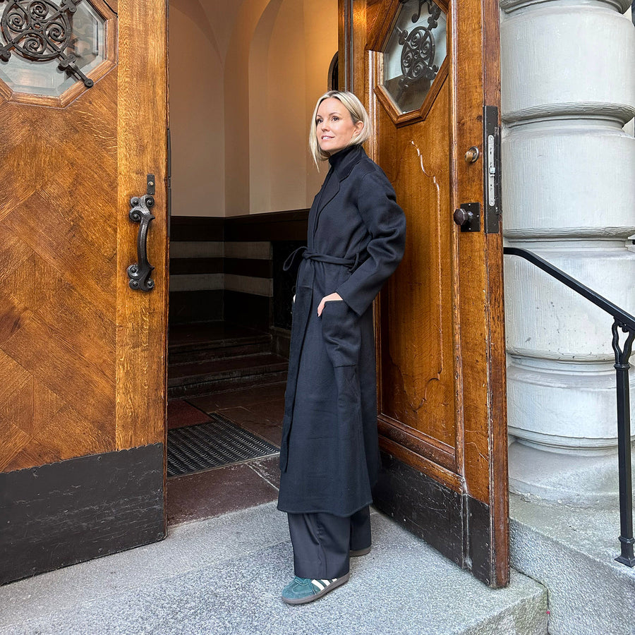 Timeless sophistication to your midweek routine wearing Wool Cashmere Doublé Robe Coat and a pair of Silk Cotton High-Waisted Trousers.