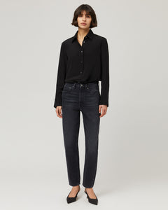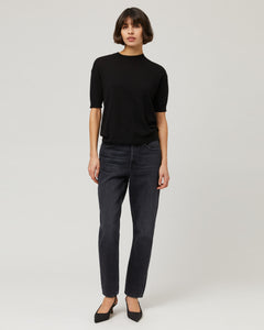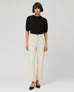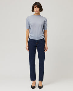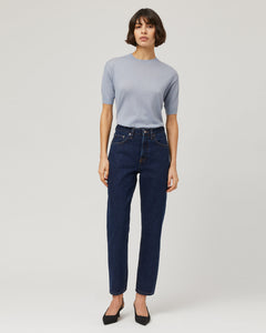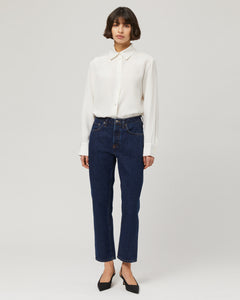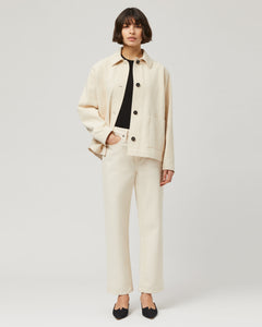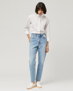 Our Denim program includes a high-waisted straight-leg fit for women in four different washes, and a regular fit tapered leg for men that comes in three washes. The model is based on a classic five-pocket and all components and hardware are made in Italy. The fabric is regenerative cotton, and the buttons and rivets are made from recycled metal.