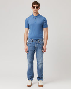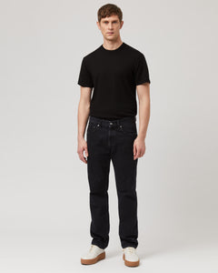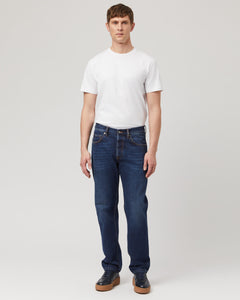 Our Denim program includes a high waisted straight leg fit for women in four different washes, and a regular fit tapered leg for men that comes in three washes. The model is based on a classic five pocket and all components and hardware are made in Italy. The fabric is regenerative cotton, and the buttons and rivets are made from recycled metal.