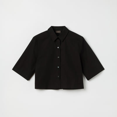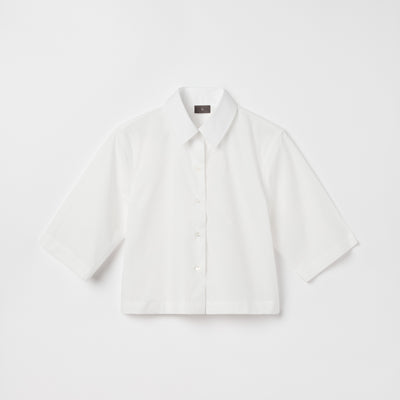Our Women's Cotton Poplin Short Sleeve Shirt is crafted from 100% extra-fine 150 gsm cotton yarn from the legendary mill Beste in Italy. The shirt comes in elbow-length with a turn-down collar and Shell Troca buttons. The super poplin silk finish gives this summer essential natural comfort and a sharp look. Buttoned up with a visible placket, cropped fit, a boxy silhouette and a box pleat at the back. Wear it to work or seamlessly blend in after hours. Combine it with the Women's Cotton Poplin Skirt for a perfect match.